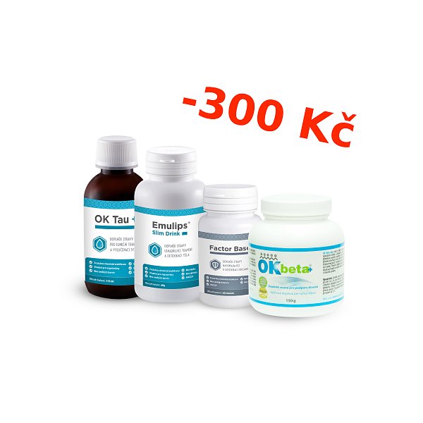 Sada Uro pack pro posílení vylučovacího systému obsahuje tyto produkty: Emulips Slim drink, Factor Base, OK Beta+, OK Tau+.